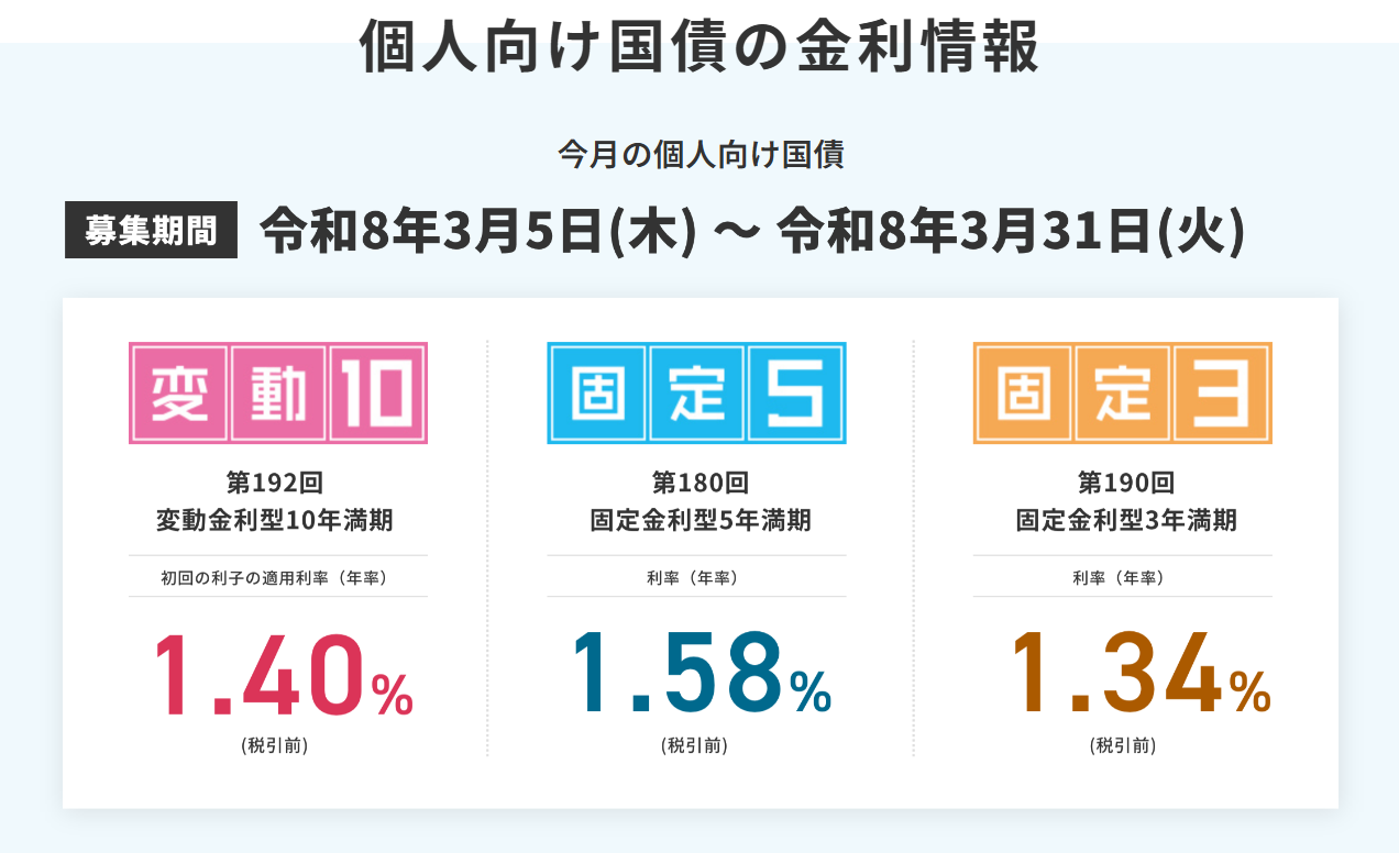 放送でも触れましたが、3月5日から31日まで募集されている個人向け国債の金利は3月4日に公表され、次のとおりとなりました。